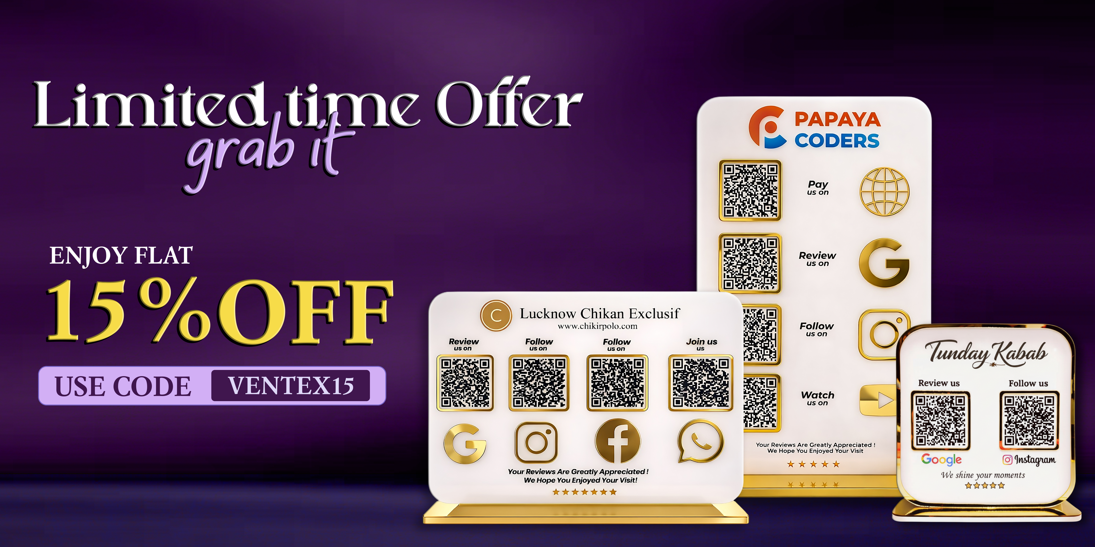 Ventex Technology ka QR review standee simple, premium aur effective hai. QR scan easy hai aur customer naturally review dene ke liye motivate hota hai.