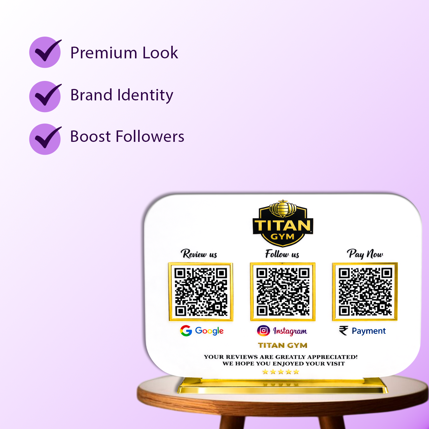 Ye ek premium acrylic standee hota hai jisme ek ya multiple QR codes hote hain. Customer scan karke turant Google review de sakta hai, WhatsApp pe chat kar sakta hai, social pages follow kar sakta hai ya aapki website visit kar sakta hai.