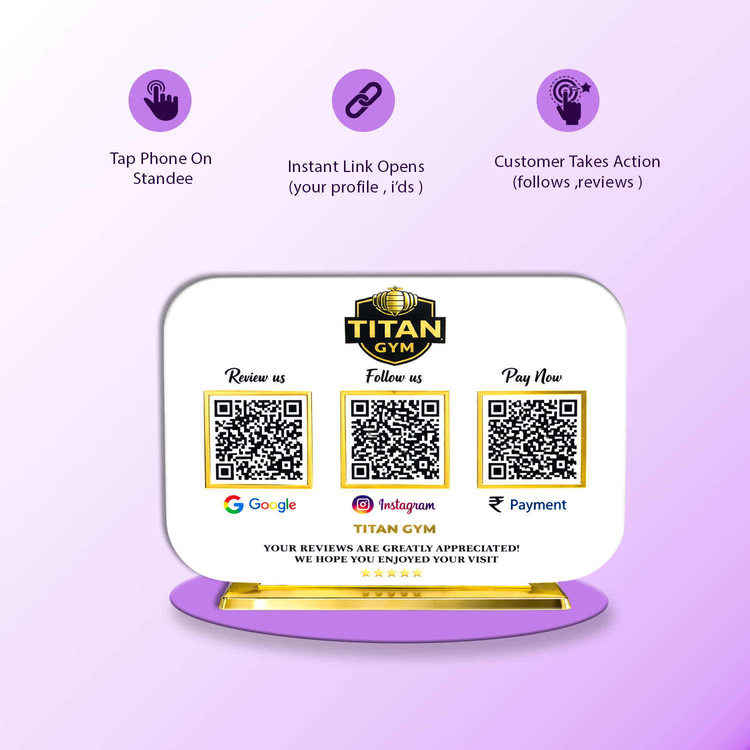 Customer QR scan ya NFC tap karta hai aur direct aapke Google review, WhatsApp, Facebook, Instagram page par pahunch jata hai.