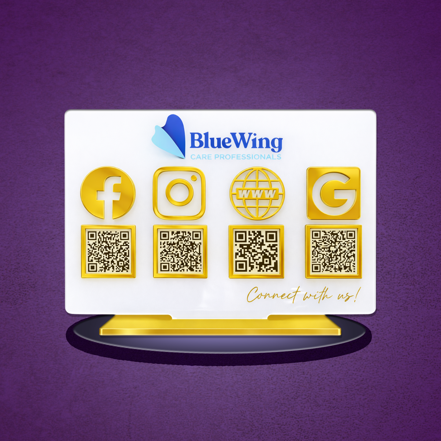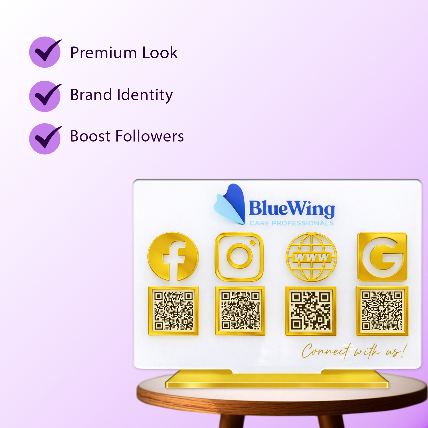 Ye ek premium acrylic standee hota hai jisme ek ya multiple QR codes hote hain. Customer scan karke turant Google review de sakta hai, WhatsApp pe chat kar sakta hai, social pages follow kar sakta hai ya aapki website visit kar sakta hai.
