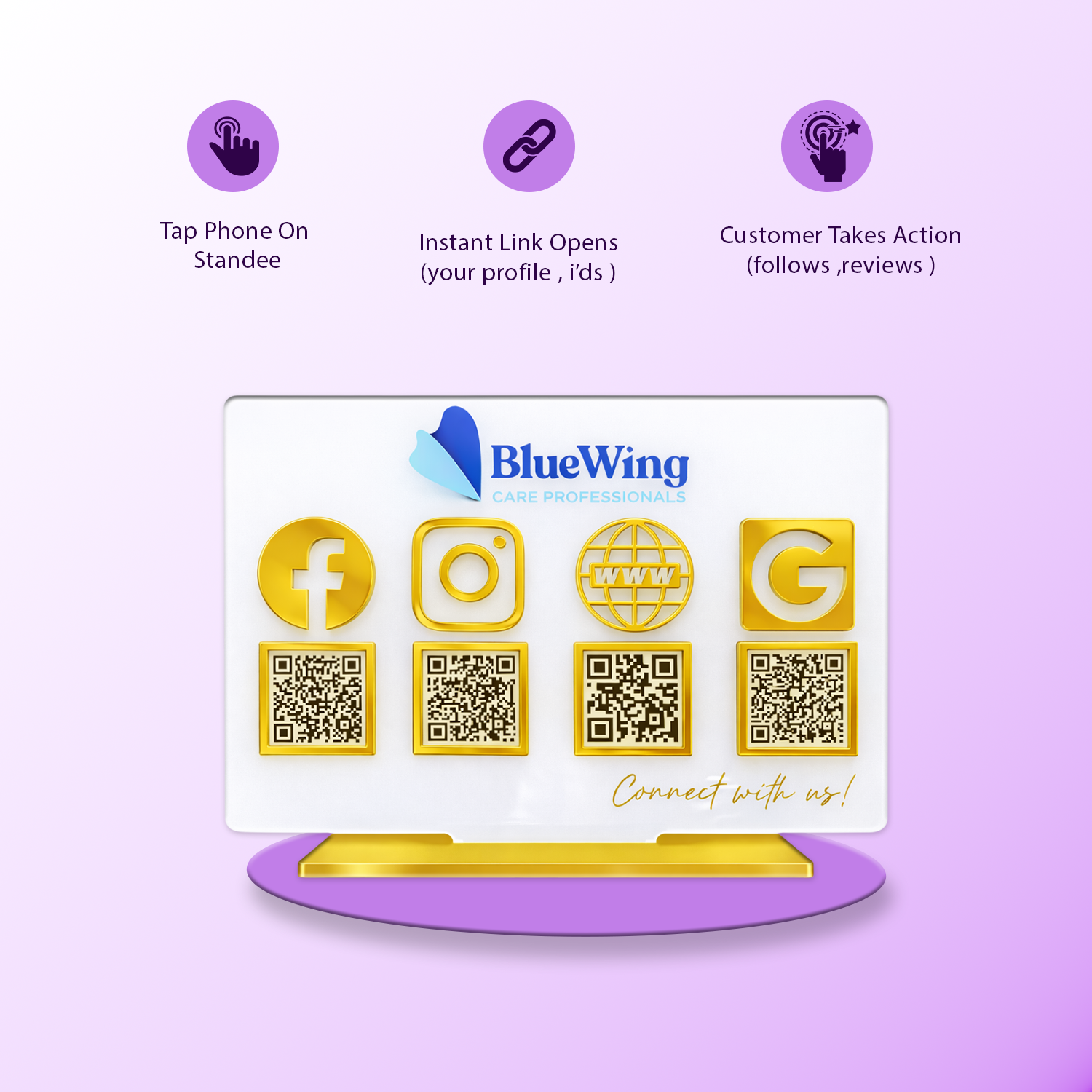 Customer QR scan ya NFC tap karta hai aur direct aapke Google review, WhatsApp, Facebook, Instagram page par pahunch jata hai.
