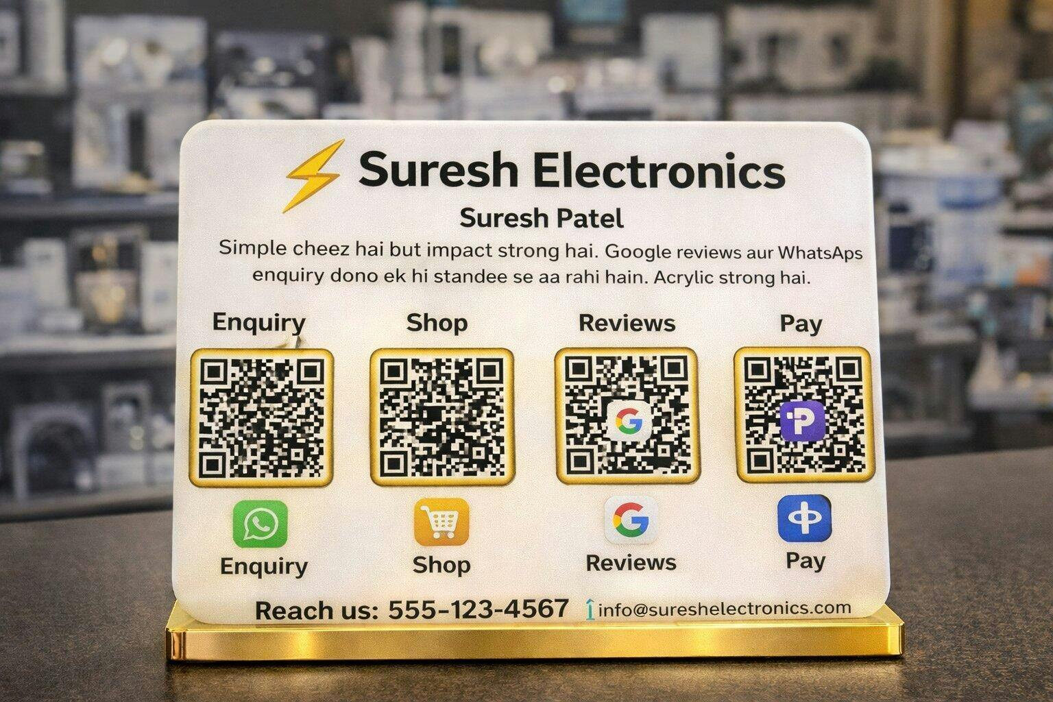 Ye ek premium acrylic standee hota hai jisme ek ya multiple QR codes hote hain. Customer scan karke turant Google review de sakta hai, WhatsApp pe chat kar sakta hai, social pages follow kar sakta hai ya aapki website visit kar sakta hai.