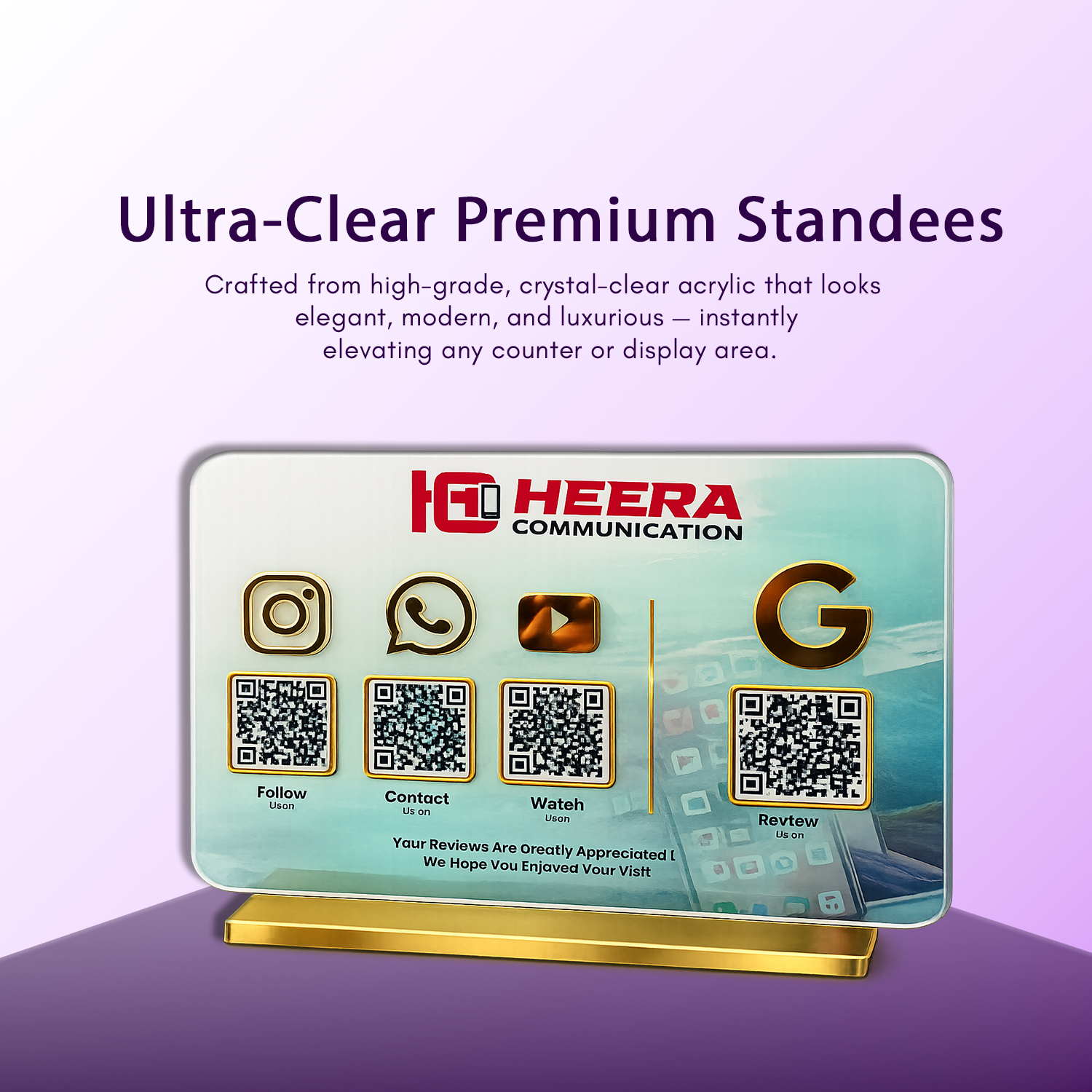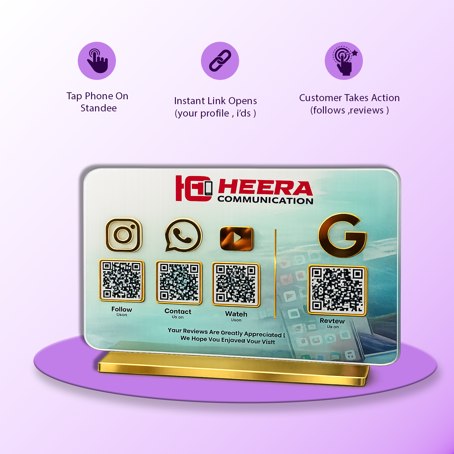 Ye ek premium acrylic standee hota hai jisme ek ya multiple QR codes hote hain. Customer scan karke turant Google review de sakta hai, WhatsApp pe chat kar sakta hai, social pages follow kar sakta hai ya aapki website visit kar sakta hai.