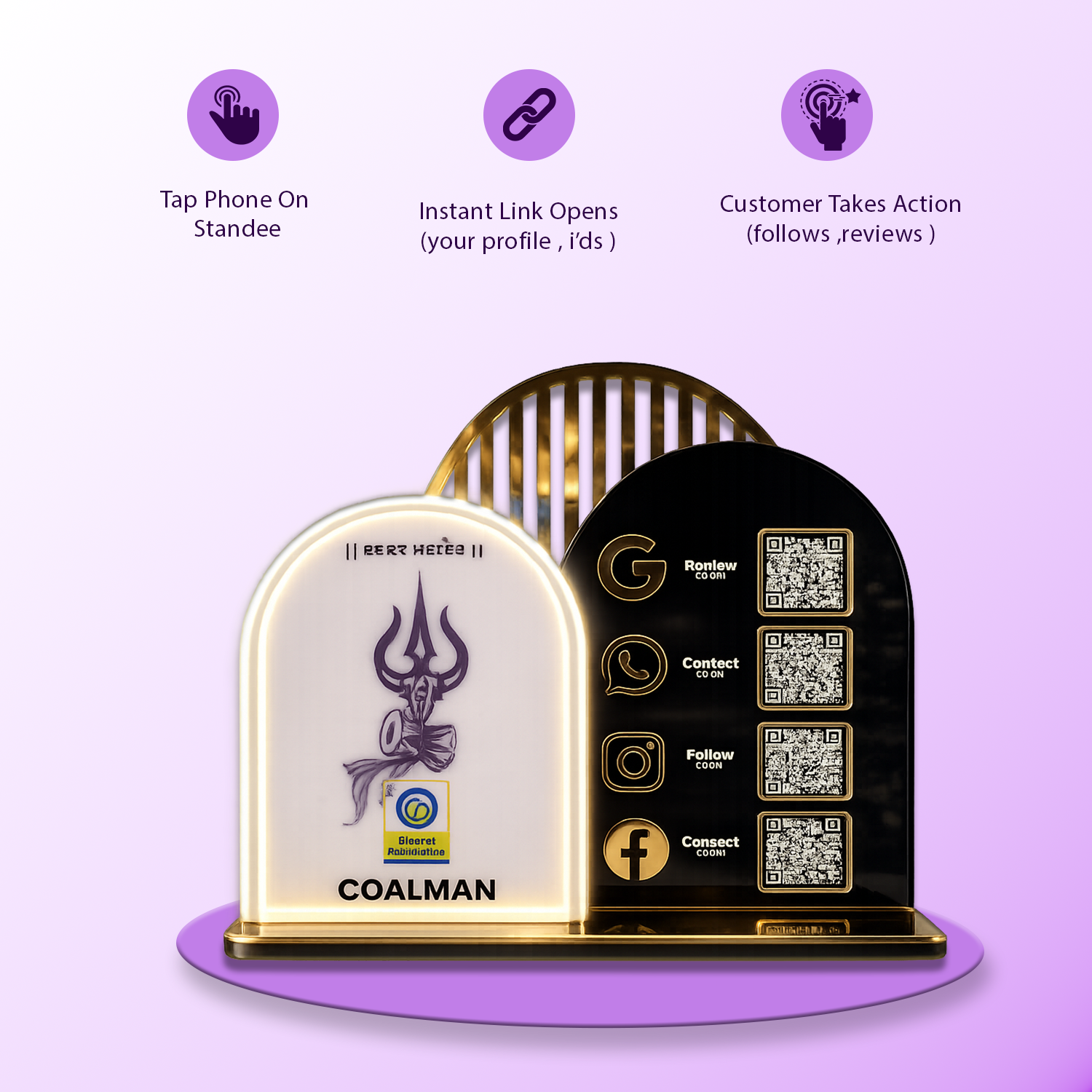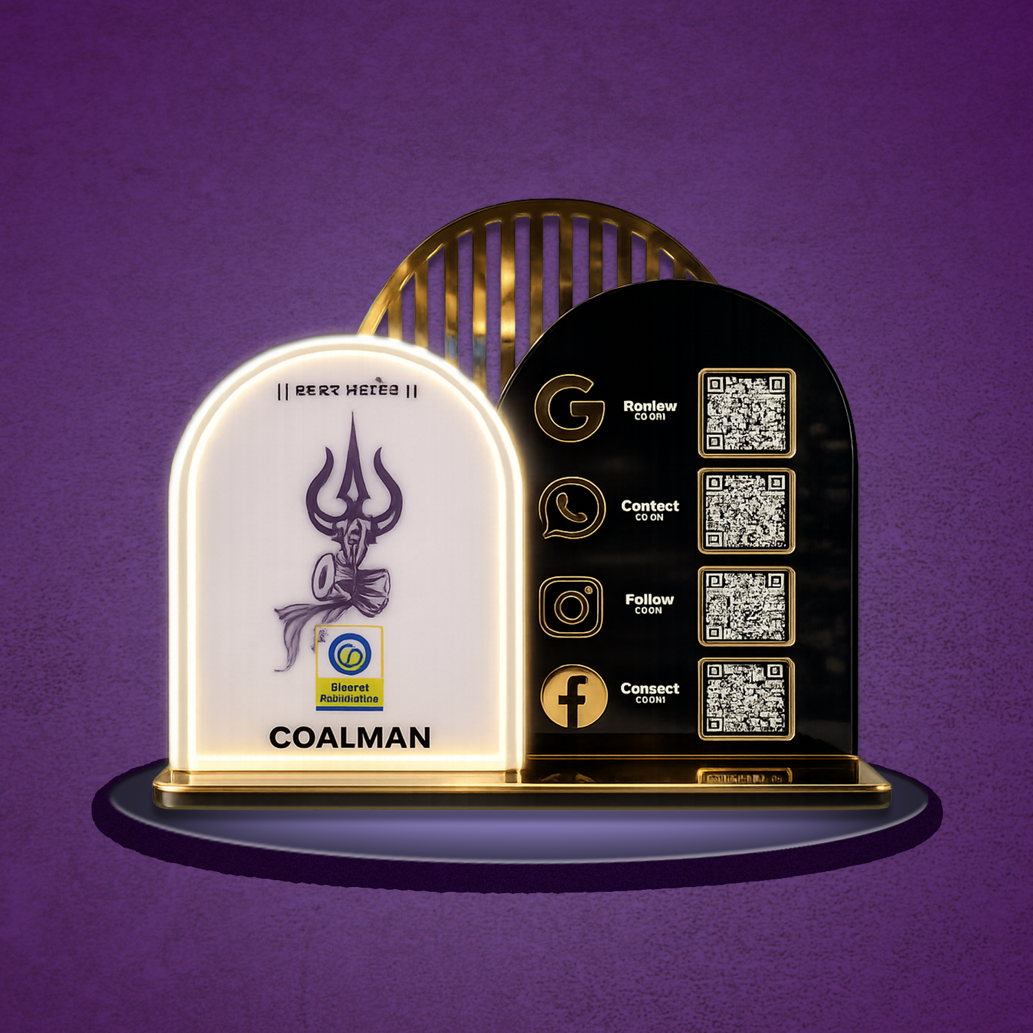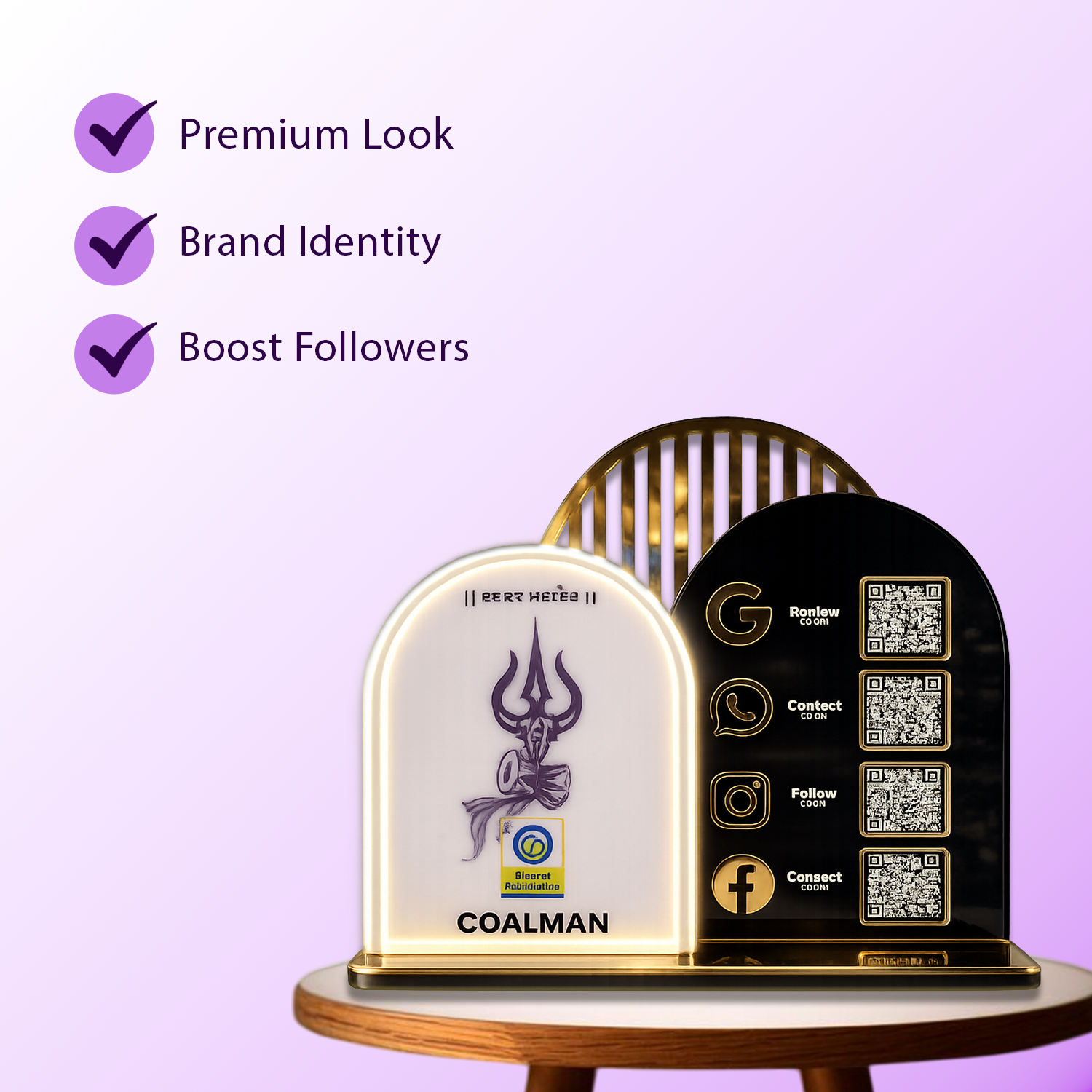 Ye ek premium acrylic standee hota hai jisme ek ya multiple QR codes hote hain. Customer scan karke turant Google review de sakta hai, WhatsApp pe chat kar sakta hai, social pages follow kar sakta hai ya aapki website visit kar sakta hai.